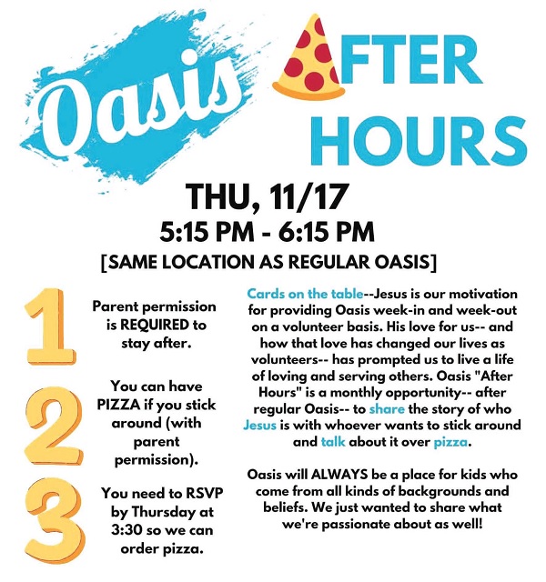 • How every need is met: When thinking about community ministry, please note the brief area of services offered by Oasis - after-school programs for youth. The church does hope that more children will know God, but it chooses to do it at different times and spaces, with the addition of "Oasis after school" so that Oasis can maintain its original intention and meet the original needs of the community. After all, no matter what religious background the students come from, or whether they are interested in religion or not, Oasis is designed to allow children to have a safe place to be children in their free after-school time.