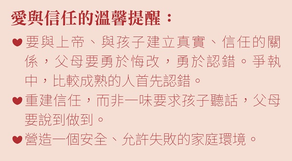 Generally speaking, when it comes to the parent-child relationship, parents are often asked to "look outward" and given various ways to manage their children. Parents are encouraged to "look inward", jump out of their blind spots, and look back into their hearts. When the parents' hearts change, the children's hearts will be miraculously healed and changed by love, thus restoring a beautiful relationship.