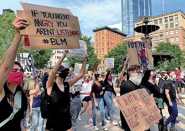 ▲波士頓市民戴上口罩,高舉為黑人維權的示威口號。(供圖:劉晏君)