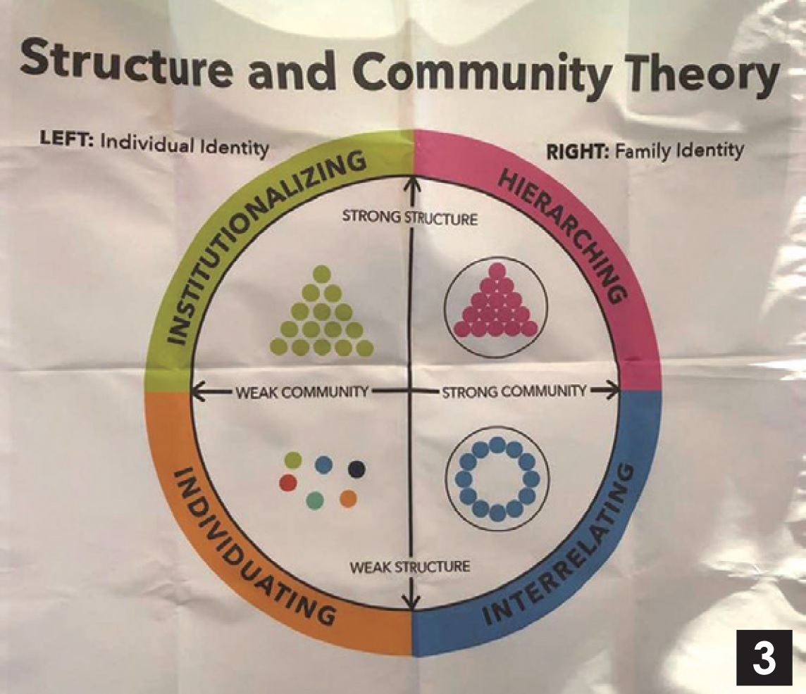 Sheryl老師以圖表和實例講解四種文化型態(圖3):社群意識弱、結構意識弱的個人文化(Individuating);社群意識弱、結構意識強的機構文化(Institutionalizing);社群意識強、結構意識強的階層文化(Hierarching);社群意識強、結構意識弱的關聯文化(Interrelating)。她也引導同學們從族譜(家庭樹)、原生家庭的教養方式、兒時住家的平面圖,開始思想自己的文化型態。