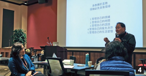 春季退修會特別安排本刊人才單元【職場人際關係系列】專欄作者林豐樑長老帶領一場「領導的藝術」講座(圖4),融合聖經真理、企業經驗、閱讀觀察,整理出「領導力即是影響力」的心得,並提醒領導者的責任是「讓跟隨者吃飽」,餵養他們的身心靈。