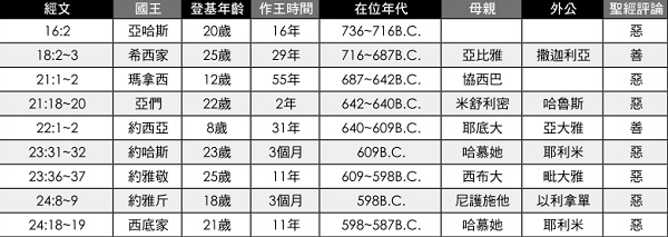 Why did God-fearing fathers like Hezekiah and Josiah fail to raise godly descendants? Why do fathers who rebel against God, such as Ahaz and Amon, have sons who follow God wholeheartedly? The Bible does not tell us the answer directly, but there seem to be clues in the scriptures. When the biblical authors record the coming of a new king to the throne, they follow a certain format - in addition to stating how old he was at the time and how many years he had been king, before commenting on whether he was good or bad, he must first specify who his biological mother is, and most of them include his maternal grandfather. His name is also recorded.