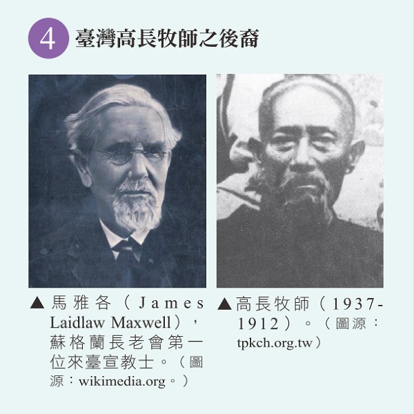 Laidlaw Maxwell (1836-1921), the first Scottish Presbyterian missionary to Taiwan, was one of the first believers in southern Taiwan and was also the first preacher in Taiwan (1837-1912). Pastor Gao Chang had five sons, two of whom became pastors and three of whom served as doctors. Among the twenty male grandchildren, three are entrepreneurs and engineers, five are pastors (including Pastor Gao Junming), and 12 are doctors (including Gao Tiancheng, who was the director of the National Taiwan University Hospital). There are hundreds of descendants of the fourth generation, and they are full of talents, and most of them have become pastors, doctors, professors and professionals (including Gao Lili, the founder of the Kingdom Resources for Christ Association). 33