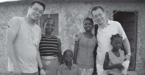 ▲新澤西傳福中心許宗實牧師(右一)與李山姆(左一)牧師與當地一家庭合影;傳福中心的短宣隊曾為這個家庭蓋房子、建廁所。