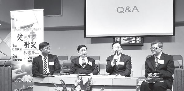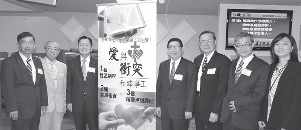 ▲Love and Conflict Reconciliation Ministry invites pastors to discuss the principles of conflict management. The speakers include (from left) Pastors Lin Guoliang, Su Wenlong, Zhong Shihao, Chen Zongqing, and Qiu Maosong, as well as ministry leaders Liu Zhepei and Wang Lanxin.