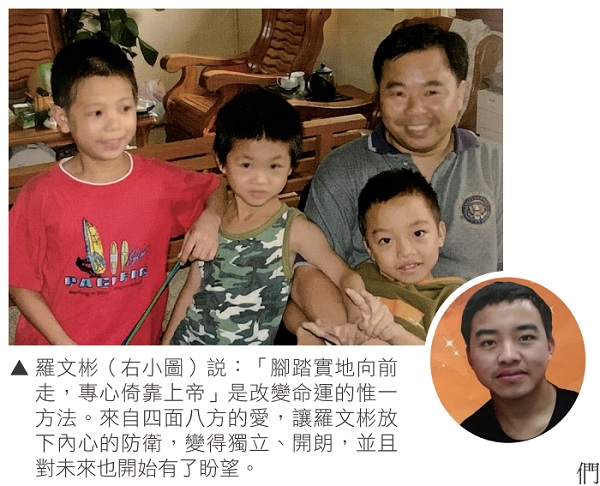 八歲的小男生,該是無憂無慮、天真爛漫,是爸媽懷中的寶貝……然而,羅文彬卻因父親去世,媽媽遠走他鄉,被迫回到農村與年邁的奶奶同住。但,神並沒有忘記他,2006年,文彬成為三明角聲華恩兒童村的一員。在一次對外公開演講中,羅文彬滿懷感恩地述說這些年來的心路歷程。