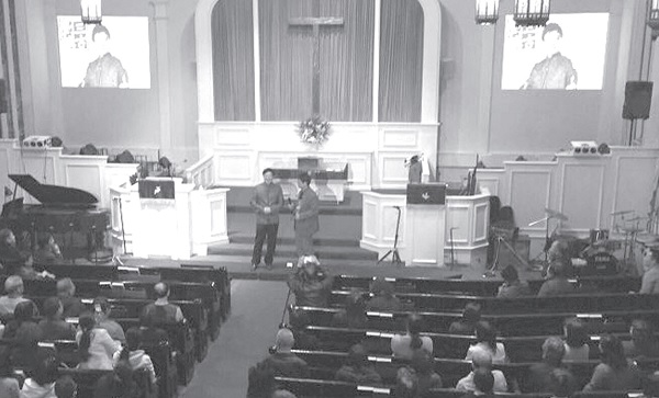 ▲Pastor Liu Xiaoting, a second-generation Taiwanese from outside the province, shared information in Taiwanese at the New City Reformed Church in New York. Pastor Su Guicun (right), who is native to Taiwan, translated in Chinese for Pastor Liu.