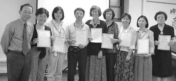 ▲2009年文字營培訓班「心與筆的飛躍」結業,助教敏雯(右二)與美惠(右三)與同學們同獲蘇老師(左一)頒發證書。