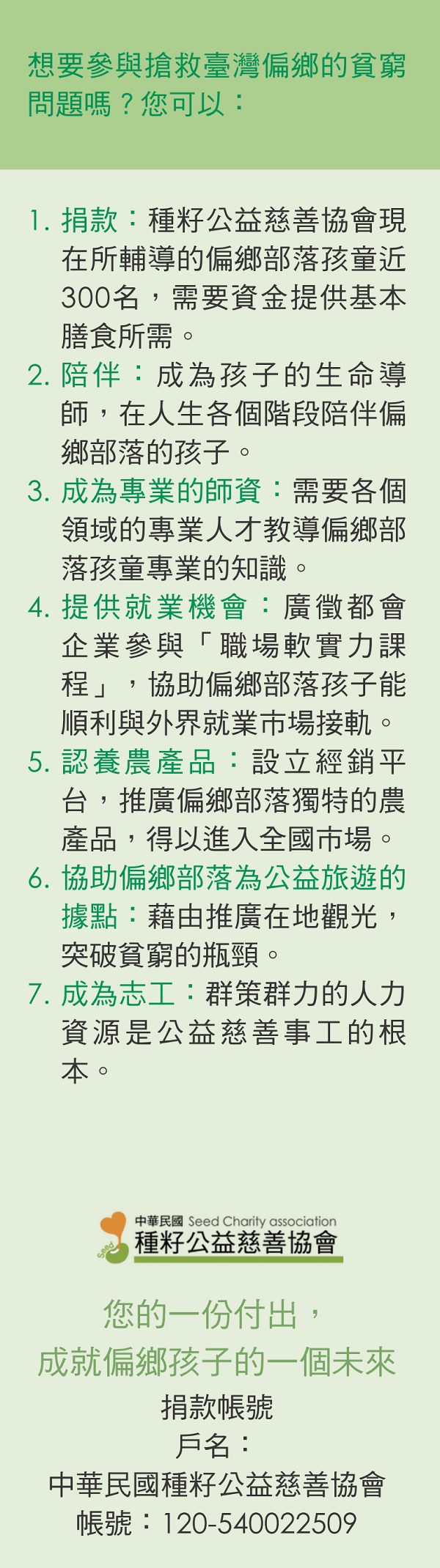 However, the crux of Taiwan's rural poverty problem does not entirely lie in laws. Q School founder Liu Ting'an's column "The World I See" contains a thought-provoking article "Thinking of the Poor". He mentioned that the reason why children in rural areas inherit poverty is because they do not know that there are better choices and lack the vision to "make good decisions." He said: "Urban children know from an early age what internships they should apply for, which clubs they should join, which friends they should make, and which industry they should enter before they will have a future. But children from rural areas know nothing about these. They go to restaurants to serve dishes, They may make money faster by going to the electrical appliance shop to repair computers or moving bricks on construction sites, but they are not helpful at all to the majors they study and the careers they aspire to.”