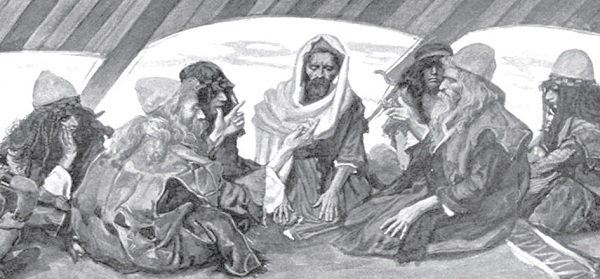 ▲摩西接受岳父葉忒羅的建議(出埃及記18:13-27)。Jethro and Moses (watercolor circa 1896–1902 by James Tissot)(https://en.wikipedia.org/wiki/Yitro_(parsha))