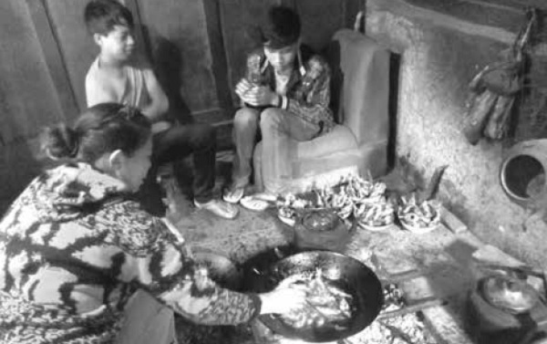 有一天,家裡擺了三張大桌,一大早幾個孩子還去自家魚塘打了好多魚上來,看來今天要擺設宴席。真的,來了好些老人家,一大家族的人一起歡聚,我們享用了好多炸得黃黃的鮮魚,非常美味!