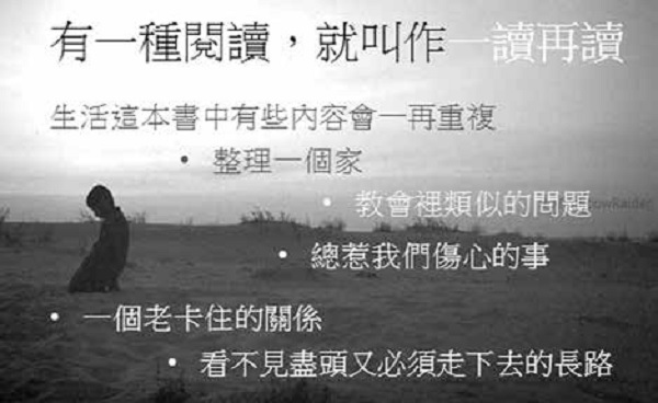 原來生活這本書中,有些內容一再重複,並不是因為作者上帝對你我無話可說,而是有一種閱讀,就叫作一讀再讀。當我們願意在不同年紀,不同心態裡,學著與書的內容對話時,漸漸我們會發現,重點不再是自己對書本內容知道多少,而是自己被作者影響改變多深。