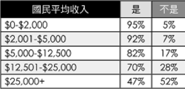 蓋洛普也就每個國家國民的平均收入做了調查,並根據這兩組相應的數據製表比較(見表一)3.