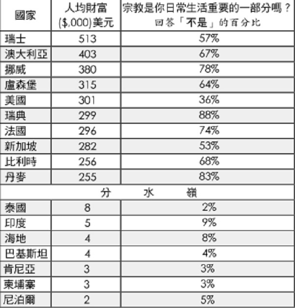 這些數據在宗教重要性與財富程度方面,在世界最富裕(較不虔誠)和最貧窮(最虔誠)國家之間清楚展現了一道巨大的分水嶺。