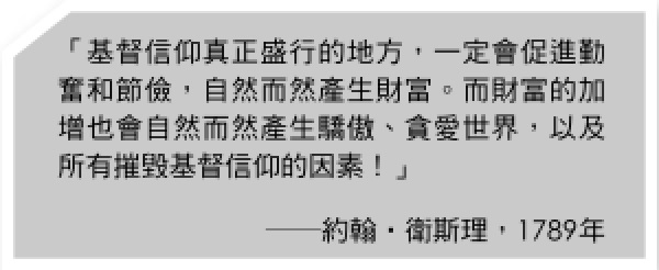 大部分基督教國家的現況,完全應驗衛理公會創辦人約翰‧衛斯理在1789年說過的一句話:「基督信仰真正盛行的地方,一定會促進勤奮和節儉,自然而然產生財富。而財富的加增也會自然而然產生驕傲、貪愛世界,以及所有摧毀基督信仰的因素!」