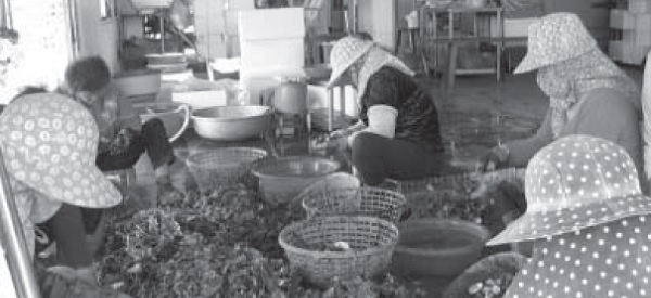 ▲東石鄉靠海,清晨到處可見婦女三三兩兩蹲坐在成堆的貝殼前剖蚵,路邊也堆滿貝殼。