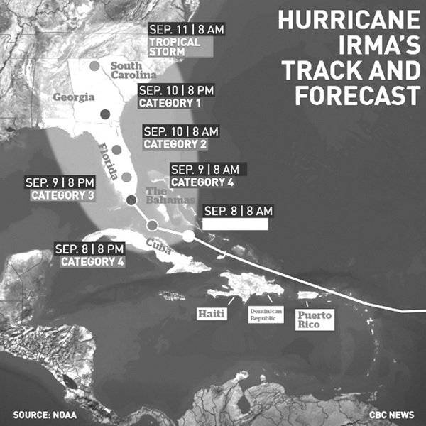 晚間新聞裡,全是艾瑪肆虐加勒比海諸島嶼的災情,預測路線已漸漸整合,基本上是從半島正中間經過。艾瑪又強又大,直徑約400英里(644公里),比佛州東西兩岸距離(約160英里,258公里)還大,也就是說整個州都會受影響。州長史考特召開記者會,再次嚴正呼籲居住瀕海、低窪地區的民眾:「沒有時間了,現在就去避難。」