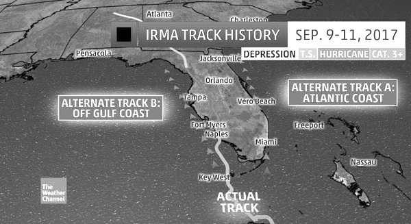 艾瑪繼續往西偏移,佛州東岸應可免受最強的風力,但需提防豪雨。此地水利局已做好功課,把人工湖、圳道的水位降低,好承接預期中的雨量。