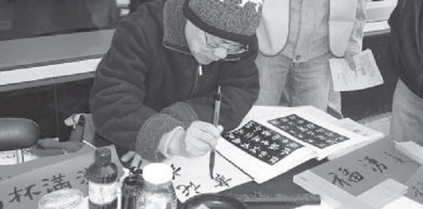 ▲許宗實牧師與教會弟兄姊妹於2009年聖誕節,特地來到紐約布魯克林區(Brooklyn)人多熱鬧的第八大道唱詩歌、傳福音,還寫了將近一百幅書法祝福大家,把主的愛散播出去,不少圍觀民眾都很開心。
