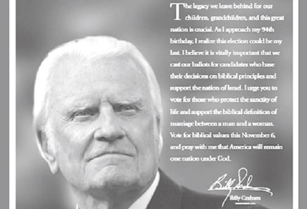 ▲2012年11月葛理翰佈道團啟動「選出聖經價值」的系列廣告,雖無指名道姓,但呼籲支持共和黨羅穆尼的心意昭然若揭,葛理翰牧師可謂因此捲入了政教爭論的風波。(圖片來源:http://mariomurilloministries.files.wordpress.com/2012/10/billy-graham-ad.jpg)