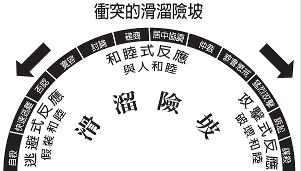 一般人在面對衝突時,直覺的反應往往不是逃避,便是攻擊。逃避式的反應包括否認(粉飾太平)、逃離(離婚、換工作、換教會)或自殺。攻擊式的反應包括以各種言詞、行為來攻擊對方,再強烈時便興訟,最極端的便是謀殺。
