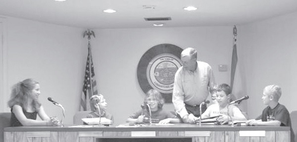 ▲Dave Browning,拉撒哈奇園鎮長,與鎮裡的學童在鎮公所實習開會。