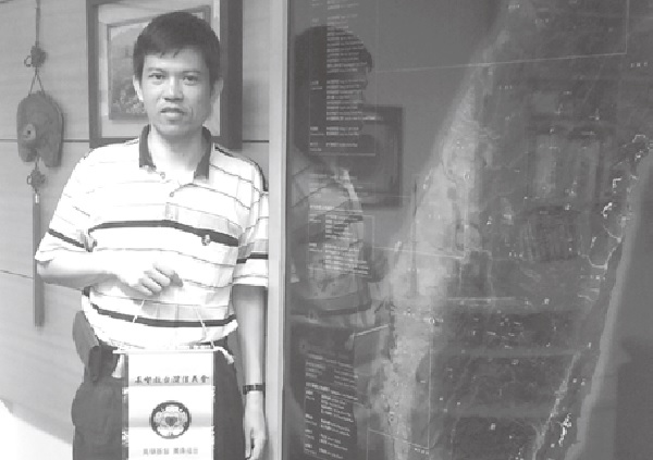 ▲臺灣信義會總會辦公室裡的漂亮臺灣地圖上標示出分布在各城市的信義會教會。作者手持該會的標誌旗幟上寫著:「高舉基督,廣傳福音」,並期許該會立足臺灣,放眼世界。