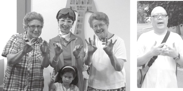 ▲修道院的修女們聽完郭小莊老師的分享,也比出京劇手勢與老師合照。 ▲京劇大師朱錦榮即興演唱京劇版的「主禱文」。