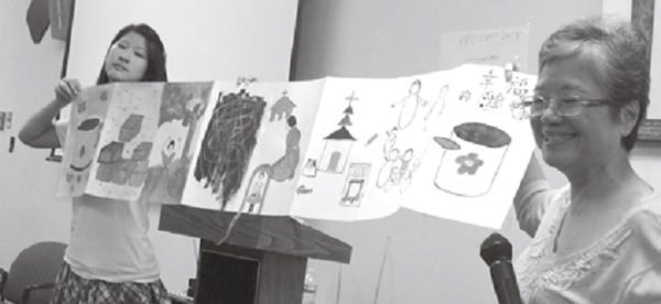 ▲本刊社區單元企編韓甲華姊妹以「幸福的滋味」人生繪本講解她的生命故事,句句打動人心。