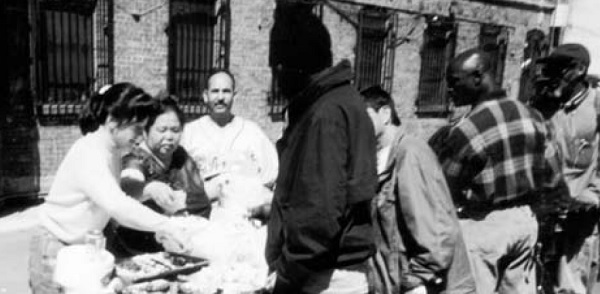 ▲王愛敏牧師(中)與義工每天分發兩餐食物餵養流浪人。