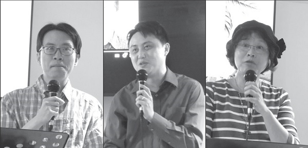 ▲藝文沙龍:吳俊德弟兄(左)、李知昂弟兄(中)、李雀美牧師分享(右)。