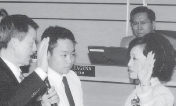 ▲苏王秀兰感谢神让她步上核桃市长岗位,看自己为基督使者,享受源自神的爱心来关怀众人。图为2010年市长就职宣誓,由国际大使命教会陈腓利牧师监誓,儿子手捧圣经为见证。