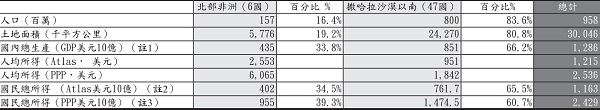 非洲大陸南北之間隔著世界上最大的沙漠「撒哈拉」(Sahara阿拉伯語沙漠),佔非洲大陸四分之一的土地,有855萬平方公里,約中國大陸面積的89%。沙漠以北多為回教徒的埃及及阿拉伯人,因此國際機構將非洲北部(以下簡稱北非)和中東視為一經濟地理區,而將撒哈拉沙漠以南視為另外一區(Sub-Saharan Africa,以下簡稱非南)。北非國家包括阿爾及利亞、吉布地、埃及、利比亞、摩洛哥及突尼西亞六個國家,領土與人口共約578萬平方公里及1.6億人,佔整個非洲的19%及16%。非南地區則包括四十七個獨立國家、一個半獨立國家(西撒哈拉)及七個屬地(分屬法國、葡萄牙、西班牙、英國管理),佔地2424萬平方公里,人口8億,佔整個非洲的81%及84%。2以國民所得總額計算,北非較為富有,佔34%;非南地區則為66%(見表1,2007年資料)由於非南地區國家及人口眾多,因此本文重點將放在該地區。