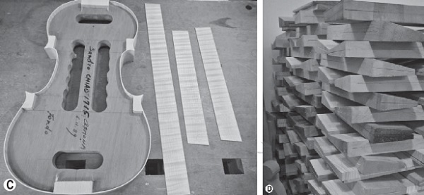 ▲所用的琴材︰正面的南斯拉夫松木(A)和背面的义大利枫木(B),需要静置二十年来稳定。焦中兴于1989年购得琴材上标示年份(C),但在这之前,木料已存放超过二十年(D)。