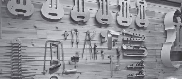 ▲木头经过利器琢磨,岁月风干,才可成为一把能发声的提琴。图为陈列于工作室中的各式面版与工具。
