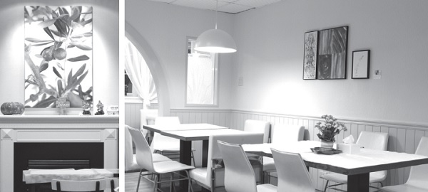 ▲墙上挂着多彩的蔬果海报、及画家寄放的黑白色系画作,营造出独特的饮食空间。