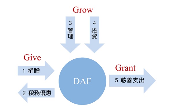 DAF 是公共慈善组织(public charity)的一种捐赠模式,由捐赠人出资在慈善基金会下设立一个子基金,捐赠一旦完成不可撤销,捐赠人立时享有捐赠的税务优惠,并可对此基金的资金用途和投资提出建议,慈善基金会拥有最终捐赠的权力。基金会为捐赠人提供专业服务管理DAF帐户;协助取得税务优惠,包括非流动性资产(例如捐赠不动产、未上市公司股票、艺术收藏品等)的估价与变现;提供多样增值保值选项;协助便捷的慈善公益捐赠支出,包括评估捐赠使用的建议是否合法合规,协助特殊对象(例如海外捐赠)的处理。