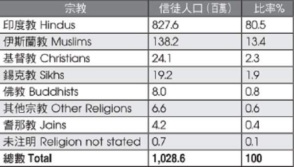 根据2001年官方人口普查,如表1所示,印度约有80.5%的人信奉印度教,其他主要宗教为伊斯兰教(13.4%)、基督教(2.3%)及锡克教(1.9%)。佛教虽起源于印度,影响力已逐渐式微,仅占总人口的0.8%,但佛教的传播对邻近国家如东南亚及中国、日本,却造成了相当大的影响。