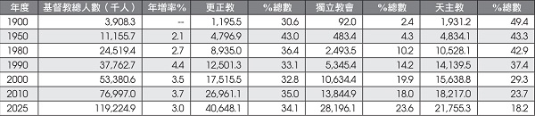 表3 印度基督教人口(千)与占基督教总人口之比例(%)(1900-2025)