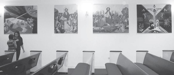 ▲位于美国佛罗里达州的埃及基督教堂,两侧墙上挂着充满埃及风采的耶稣生平事迹的画像。