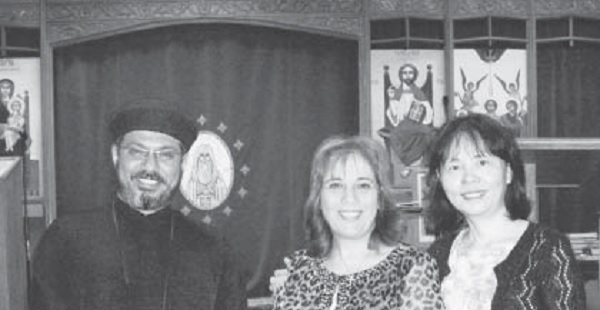 ▲塔神父、懿蔓与记者淑满(左至右)摄于圣坛前。