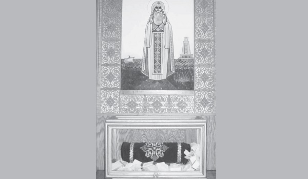 ▲于殉道圣彼得画像下面的长方形玻璃箱内存着他的遗物,信徒通常按手于上来祷告祈福。