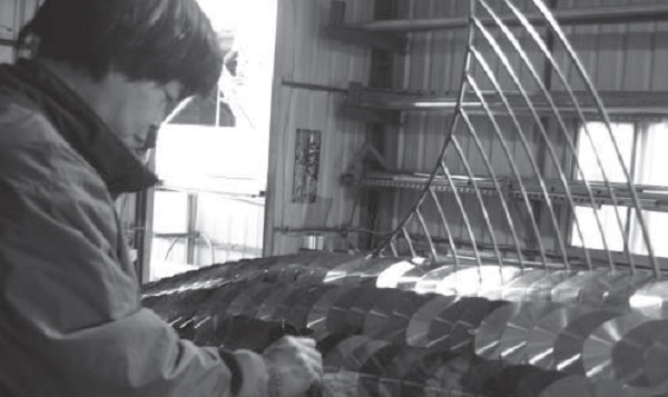 ▲製作〈思慕的魚〉 楊明忠用心觀察花草蟲鳥,再以不同素材展現心中的感動。圖為以回收光碟製作〈思慕的魚〉,2008年臺灣燈會參展作品。