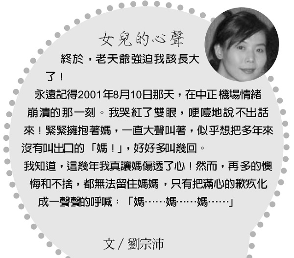 我开始工作,开始体验生活的艰辛,就算挨饿也要养活我的猫。那时,我才明白妈的委屈和辛苦。夜深人静,我一个人睡在火灾后还没整修好的房子里,因为没钱,所以没办法买电视看⋯⋯想起过去的点点滴滴,觉得自己真的很不应该!多少次,我写了寄不出去的卡片给妈,自己却哭得泣不成声。因为,我真的、真的很想要一个家,一个幸福美满的家,一个有妈妈在的家─即使少了爸爸也没关系!