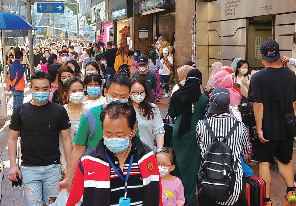 ▲新冠疫情中,亚洲人民普遍戴口罩,口罩样式没有太大区别。图为疫情中的香港街景。