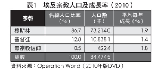 About 87% of Egypt's population believe in Islam (mainly Sunni), which is the state religion of Egypt; followed by about 13% of the population believe in Christianity, of which the Coptic Orthodox Church accounts for the majority (see Table 1, but in general Population figures are higher than other sources).