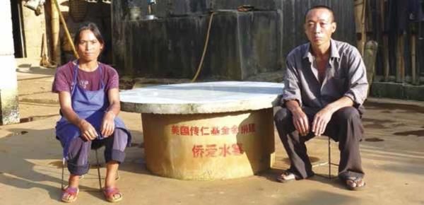 ▲A couple sits next to the water cellar built for them by Chuanren. When the dry season comes, the family no longer has to worry about running out of water.