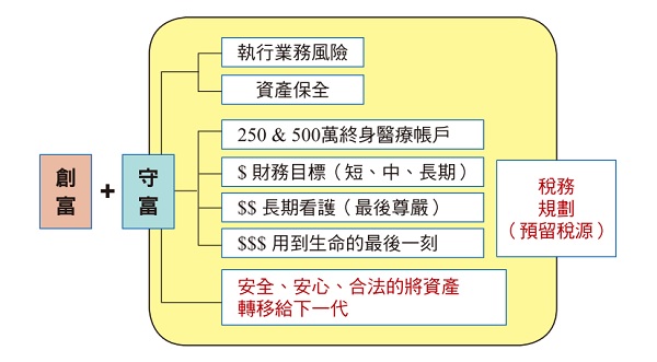 When planning a complete medical insurance, it is recommended to plan basic lifelong medical care, lifelong surgery, lifelong cancer prevention, medical out-of-pocket expenses, accident insurance, accidental hospitalization, accidental medical out-of-pocket expenses, premium exemption, and then follow each person's own responsibilities With the income budget, increase the amount of the above regular planning. Readers are requested to break the myth that "lifelong medical, lifelong surgery, and lifelong cancer insurance plans are expensive" (currently, taking a thirty-year-old male as an example, the above complete set of premiums is about NT$36,000 per year), and only plan for regular medical insurance , may lose big in the future. As long as the planning is correct and the cost is not high, there will be no need to use the saved retirement funds to pay for old-age medical expenses in the future, and it will also avoid causing pressure on children's lives, finances, and even emotional damage. If you have been delaying in purchasing lifelong medical insurance, the older you are, the higher the premium will be, and the risk of rejection due to age or physical condition will increase. In order to plan a complete lifelong medical insurance, insurance practitioners must not only have more specialties, but also need to invest in long-term care and claims services for customers in the future. Therefore, some business personnel will plan very expensive lifelong medical insurance for customers, making customers think that there is lifelong medical insurance. It is very expensive, so instead plan a savings insurance. This not only conforms to the mentality of Chinese people who love saving, but also reduces the trouble of insurance practitioners themselves in future claims settlement services. To refresh the reader's understanding of the sequence of financial planning, please refer to the attached diagram.