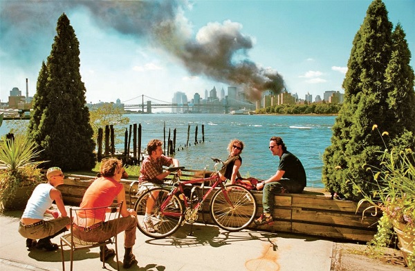 照片中顯示,五個年輕的朋友在布魯克林的河濱,似乎在吃午飯或騎車休息,享受著夏末燦爛的陽光。聊天時,背景中火龍似的煙霧吞沒了曼哈頓下城。主題人物的狀態,讓這位攝影師霍普克相當困擾。他對一位朋友說,這些人看來完全放鬆,就像在任何一個午後。他們也可能失去了親人,卻無動於衷。所以他保留照片不發表,說美國那時不需要看到這個,他怕會挑起錯誤的情緒反應。