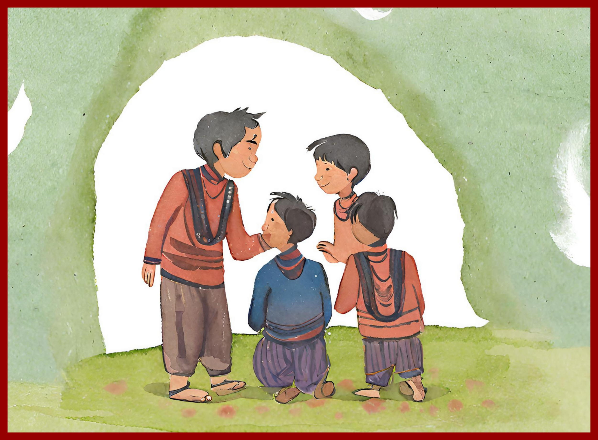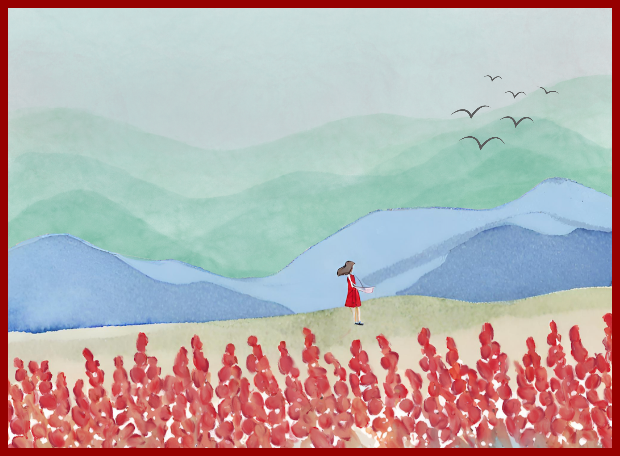 A little girl and her friends climbed up the hill, jumping, jumping, panting, letting out laughter, jingling like bright copper bells... When they reached the top of the mountain, she exclaimed and saw something It was a striking sight - a field of long-stemmed flowers, bright red and charming, swaying freely and lively on the arid highlands, calling her to embrace. The little girl ran over and immersed herself in the fiery sea. She picked the flowers with both hands and made a bouquet. She put her face against the bright petals and stared at them for a long time.